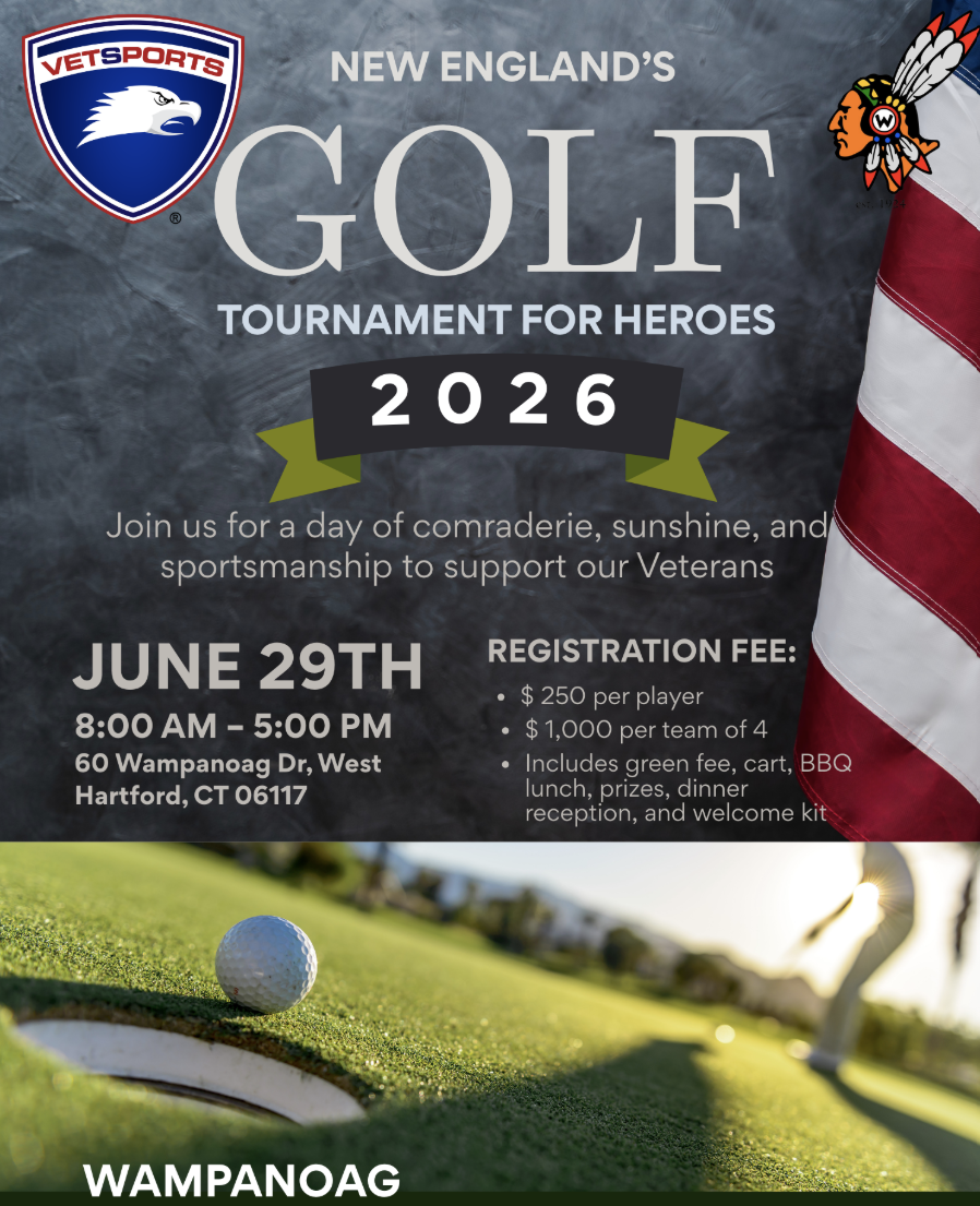 New England Golf Tournament for Heroes Monday, June 29, 2026 8:00 AM 5:00 PM 08:00 17:00 Wampanoag Country Club 60 Wampanoag Drive West Hartford, CT, 06117 United States (map) Google Calendar ICS Welcome to New England’s Golf Tournament for HeroesJoin us for an unforgettable day of golf and camaraderie at our charity event, where golfers from around the country come together to support our Veterans.